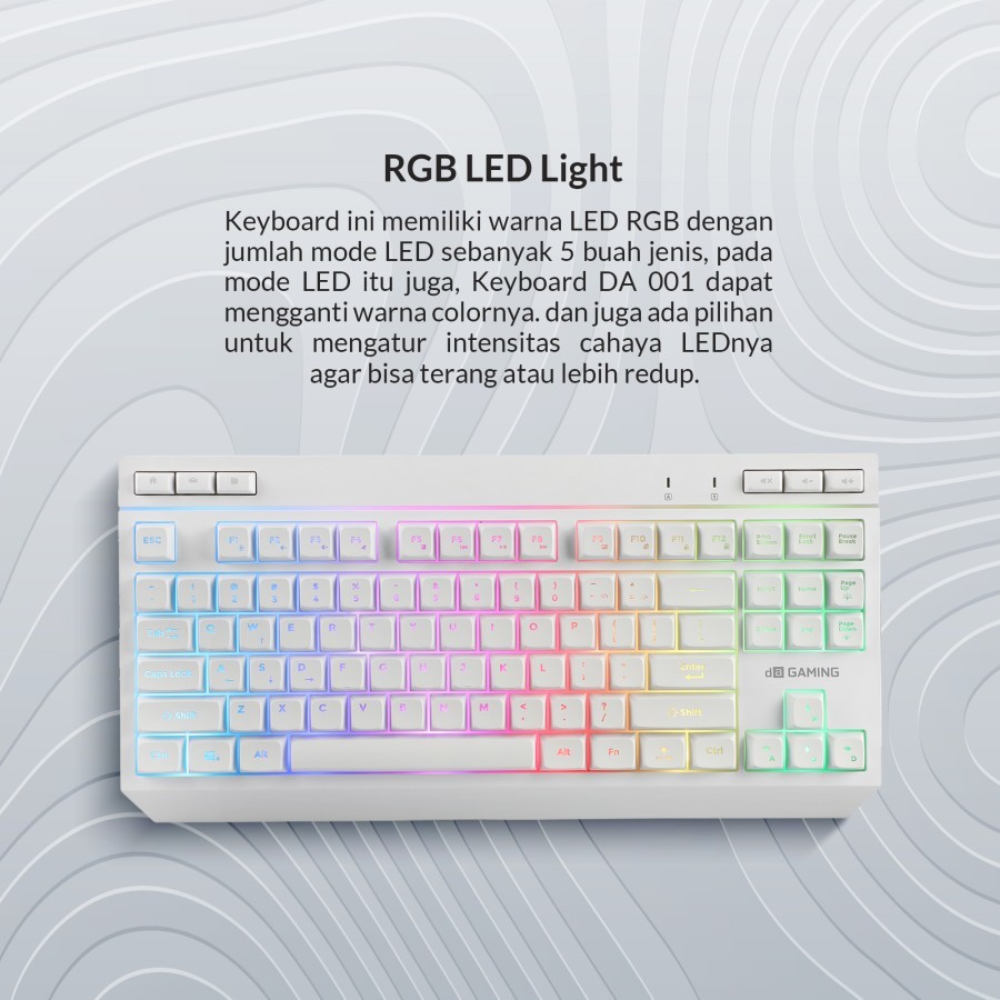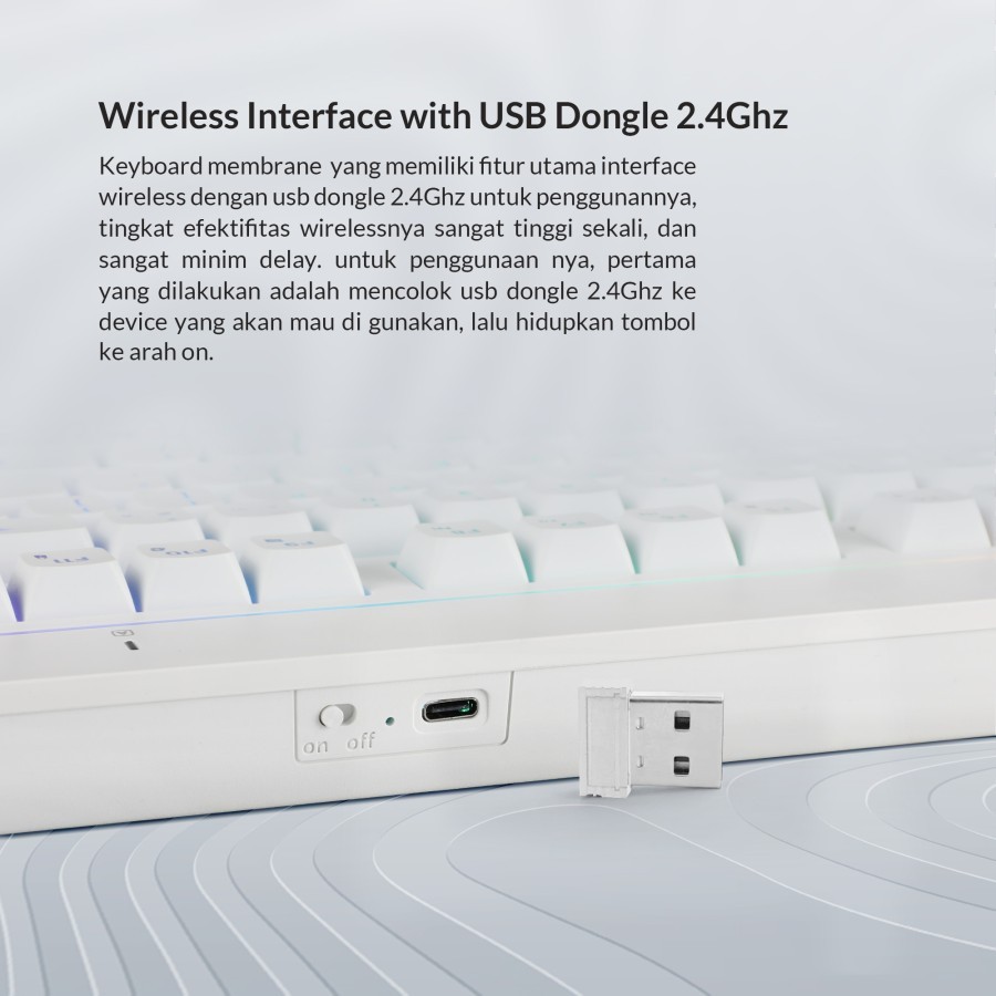 001 Membrane Wireless RGB - Dengan desainnya yang ergonomis dan kualitas yang tangguh, keyboard ini memastikan kenyamanan dan daya tahan yang optimal. Keyboard ini juga dilengkapi dengan pencahayaan RGB yang menakjubkan. Dengan berbagai pilihan warna dan efek pencahayaan yang dapat disesuaikan, Anda dapat menciptakan suasana visual yang menarik dan sesuai dengan selera Anda. Pencahayaan ini tidak hanya meningkatkan tampilan estetika keyboard, tetapi juga membantu Anda melihat tombol dengan jelas, bahkan dalam kondisi pencahayaan yang redup.