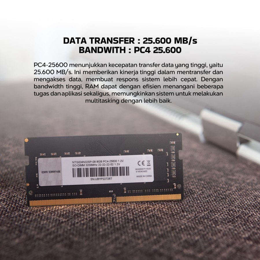 SPECIFICATION Model DA Drive SO-DIMM DDR4 Modul Type 260 Pin Small Outline DIMM Capacity 16GB Frequency 2.666 MHz Data Transfer / Bandwith 21.300 MB/s / PC4 21.300 Voltage 1.2V Latency CL-19-19-19-43 Dimension 67.6 (H) x 30 (L) mm